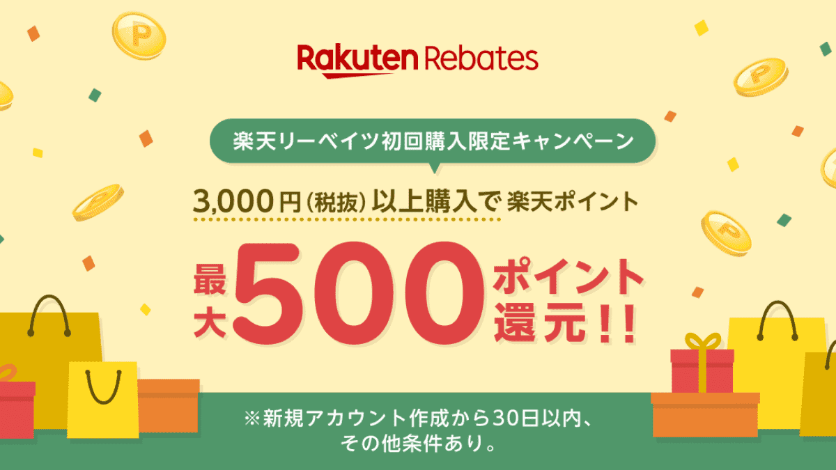さらに、初めて楽天リーベイツを利用して(アカウント作成から30日以内に)3,000円以上の買い物をすると、 最大500ポイントの初回購入ボーナス がもらえるキャンペーンも常時実施されています(※条件は変更になる場合があります)。こちらも活用して、お得にポイ活をスタートさせましょう。
